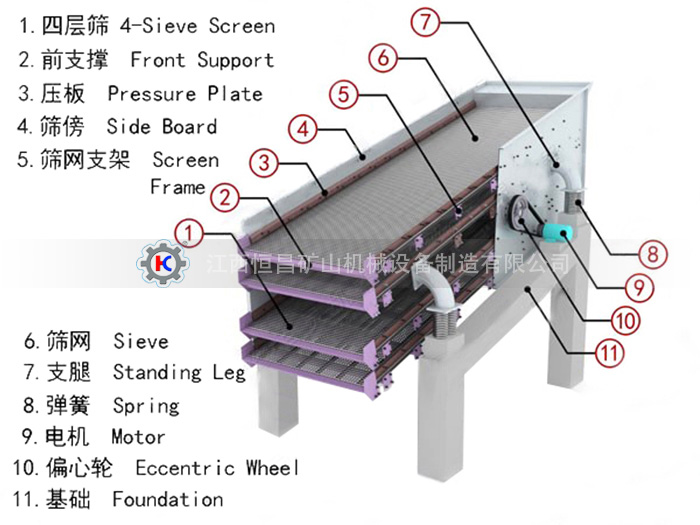 雙層振動篩設備主要由篩箱、篩網(wǎng)、偏心軸、減振彈簧裝置、底架等組成。