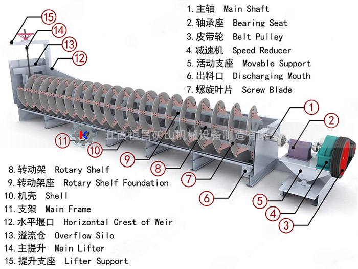 沉沒(méi)式螺旋分級(jí)機(jī)主要由傳動(dòng)裝置、螺旋體及水槽、升降裝置、下部支座和出料口等組成。