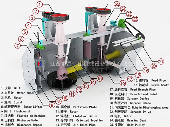 機(jī)械式攪拌浮選機(jī)設(shè)備主要由轉(zhuǎn)子、導(dǎo)向葉輪、隔倉板、刮板器、刮板驅(qū)動(dòng)等部分組成。