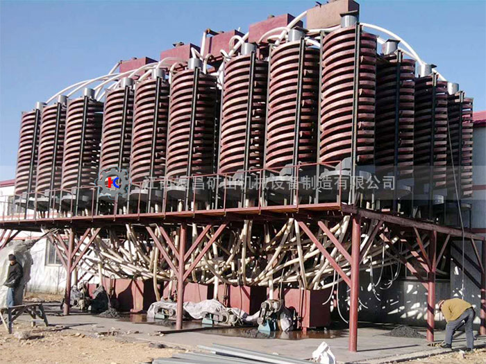 將BLL玻璃鋼螺旋溜槽立起校準(zhǔn)垂直線,用鐵架或木頭固定在合適的位置,由砂泵將礦漿送到螺旋上頂兩個(gè)進(jìn)料口處,加入補(bǔ)充水,調(diào)節(jié)礦漿濃度,礦漿自然從高往下旋流在旋轉(zhuǎn)的斜面流速中產(chǎn)生一種慣性的離心力,以礦砂的比重、粒度、形狀上的差異,在旋流的重力和離心力的作用下將礦與砂分開(kāi);螺旋溜槽的尾端裝有閥塊式產(chǎn)品截取槽,將分選的產(chǎn)品沿徑向按品位分成三種,用調(diào)節(jié)閥塊的位置來(lái)改變各產(chǎn)品的截取寬度,精礦流入精礦斗用管道接出,尾砂流進(jìn)尾砂斗用管道接到砂池。