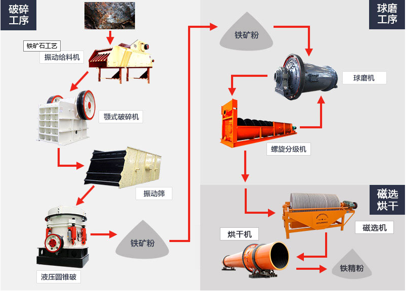 將符合選礦要求的鐵粉送入磁選機(jī)進(jìn)行強(qiáng)磁選、磁選來(lái)除去雜物;將得到的鐵粉送入烘干機(jī)烘干就可以得到鐵精粉。